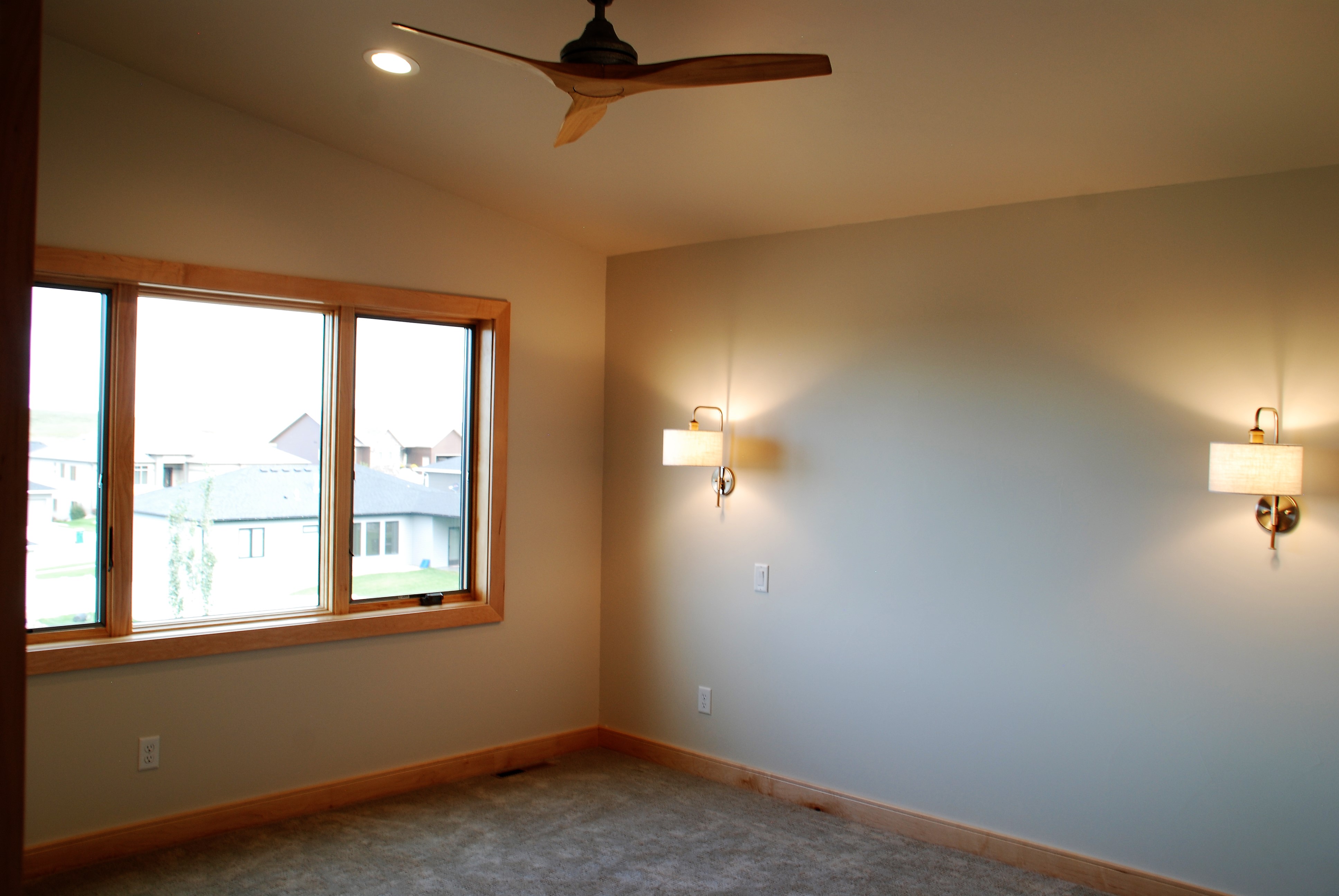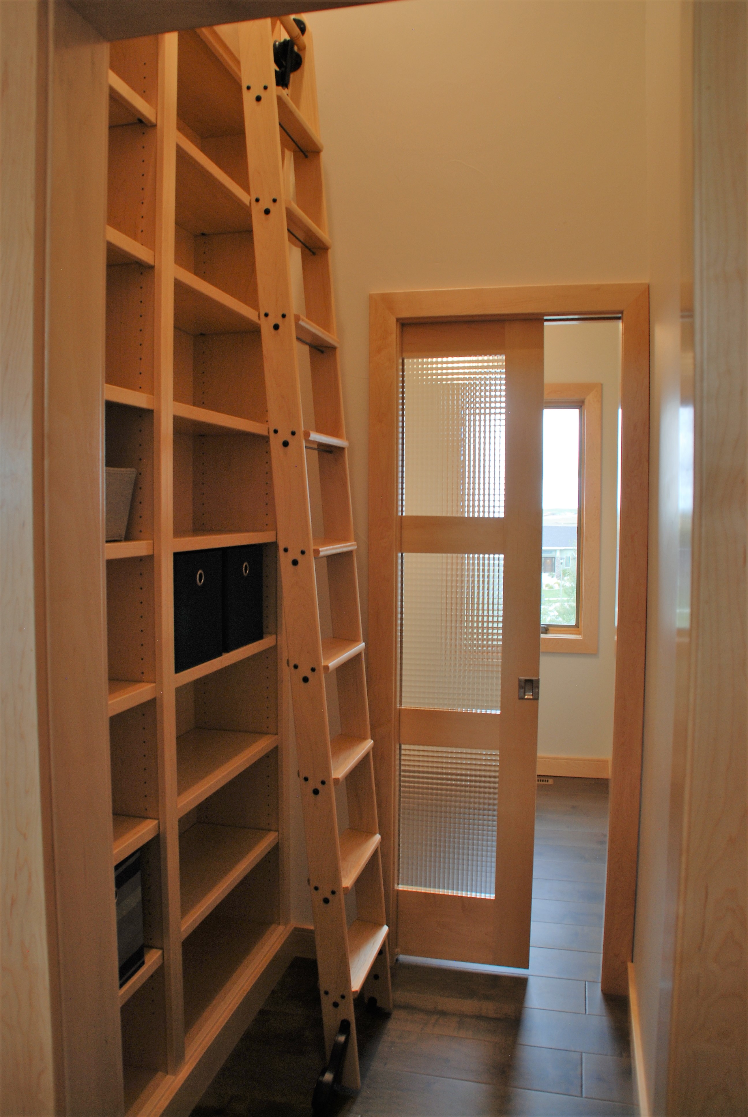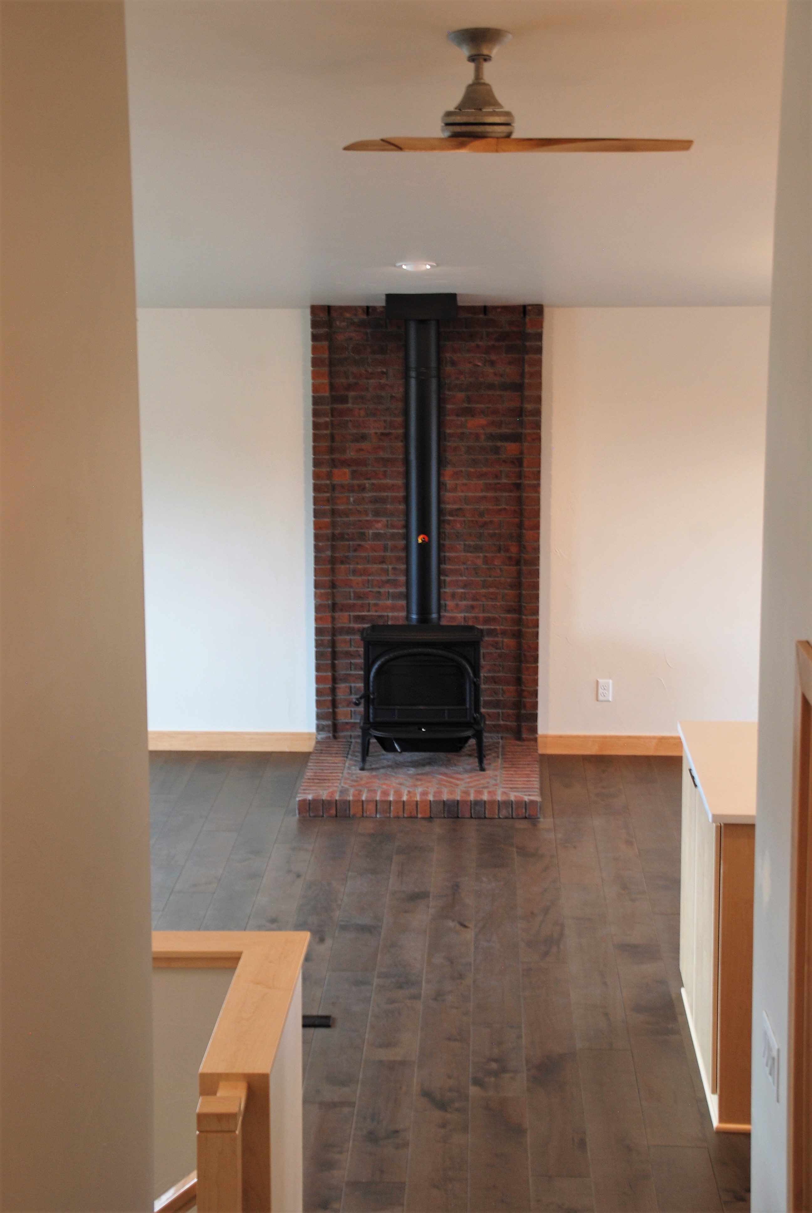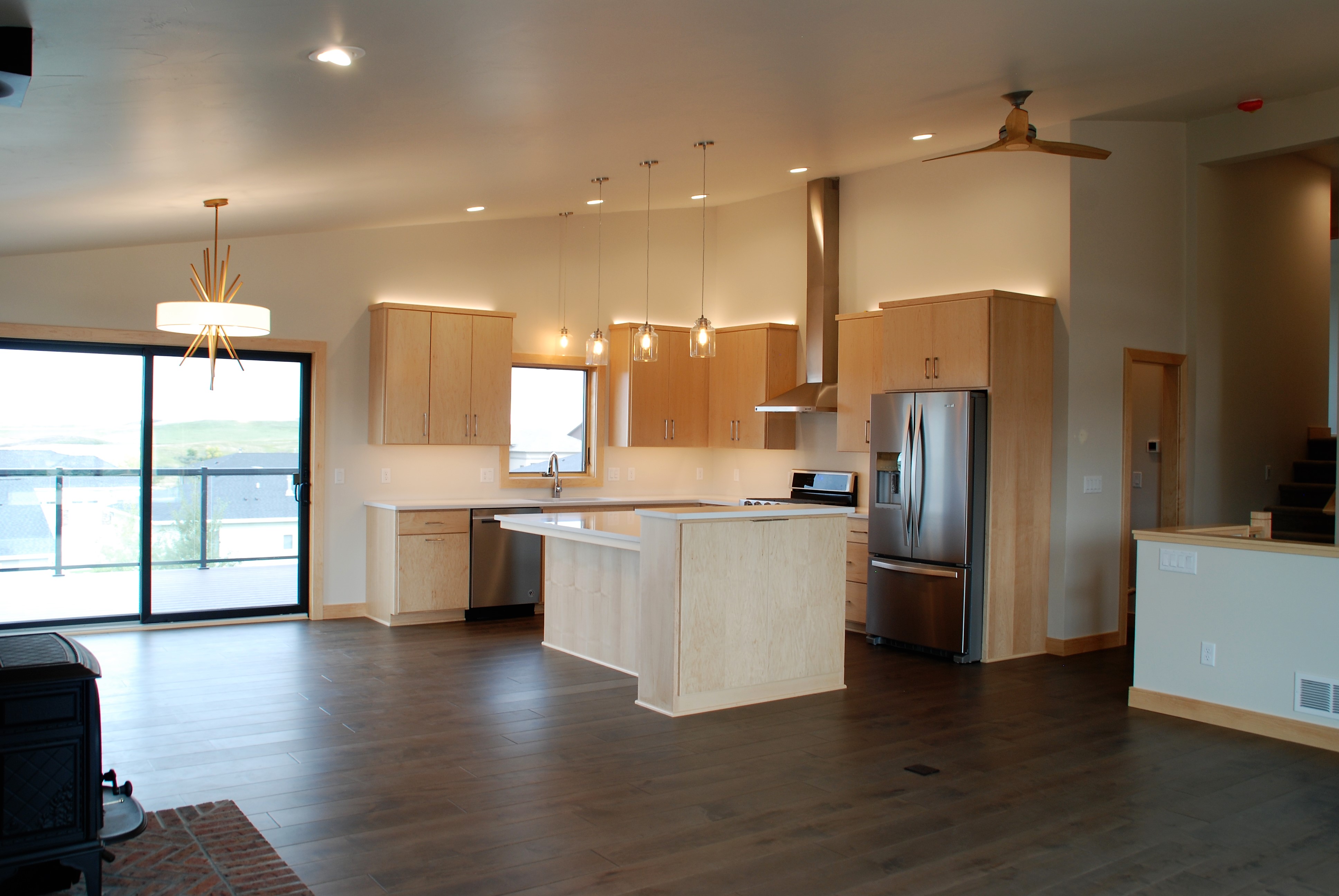 Right sized spaces; custom, clean-line light-color maple cabinets; and big impact items like a jotul wood-burning stove, tucked-away office, and storage-and-library-ladder room bring out the personality in this new home.